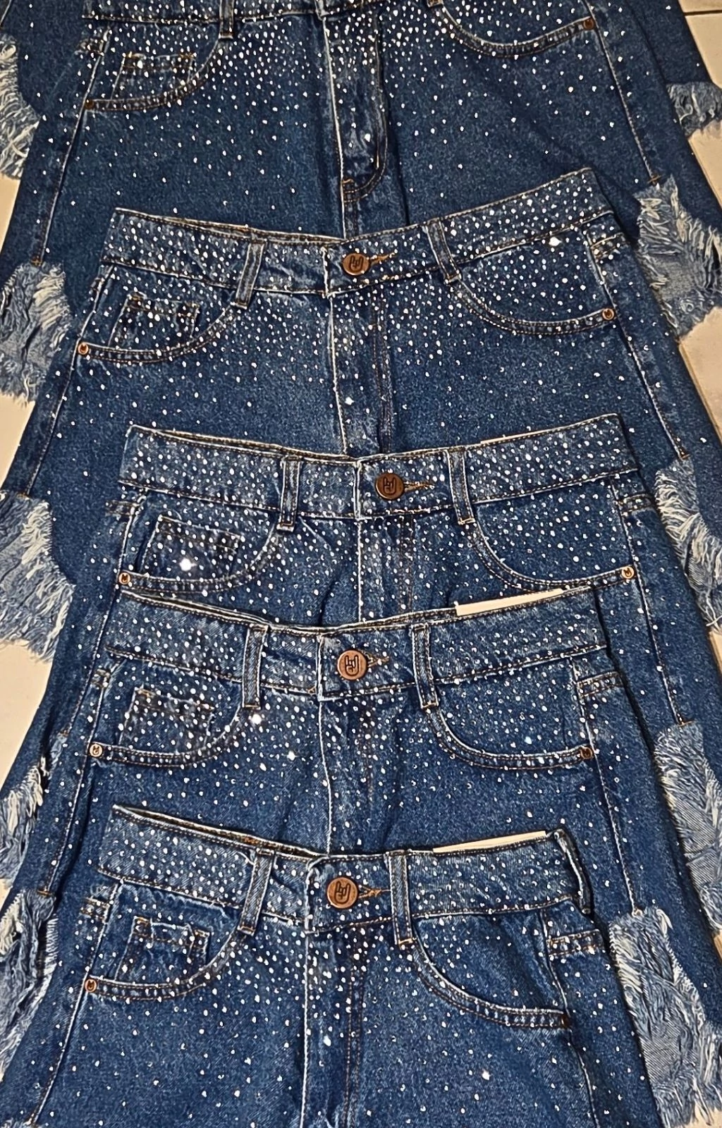 Short de jean rígido con deflecado y strass. Calce perfecto. Tendencia. Lo vas a amar!